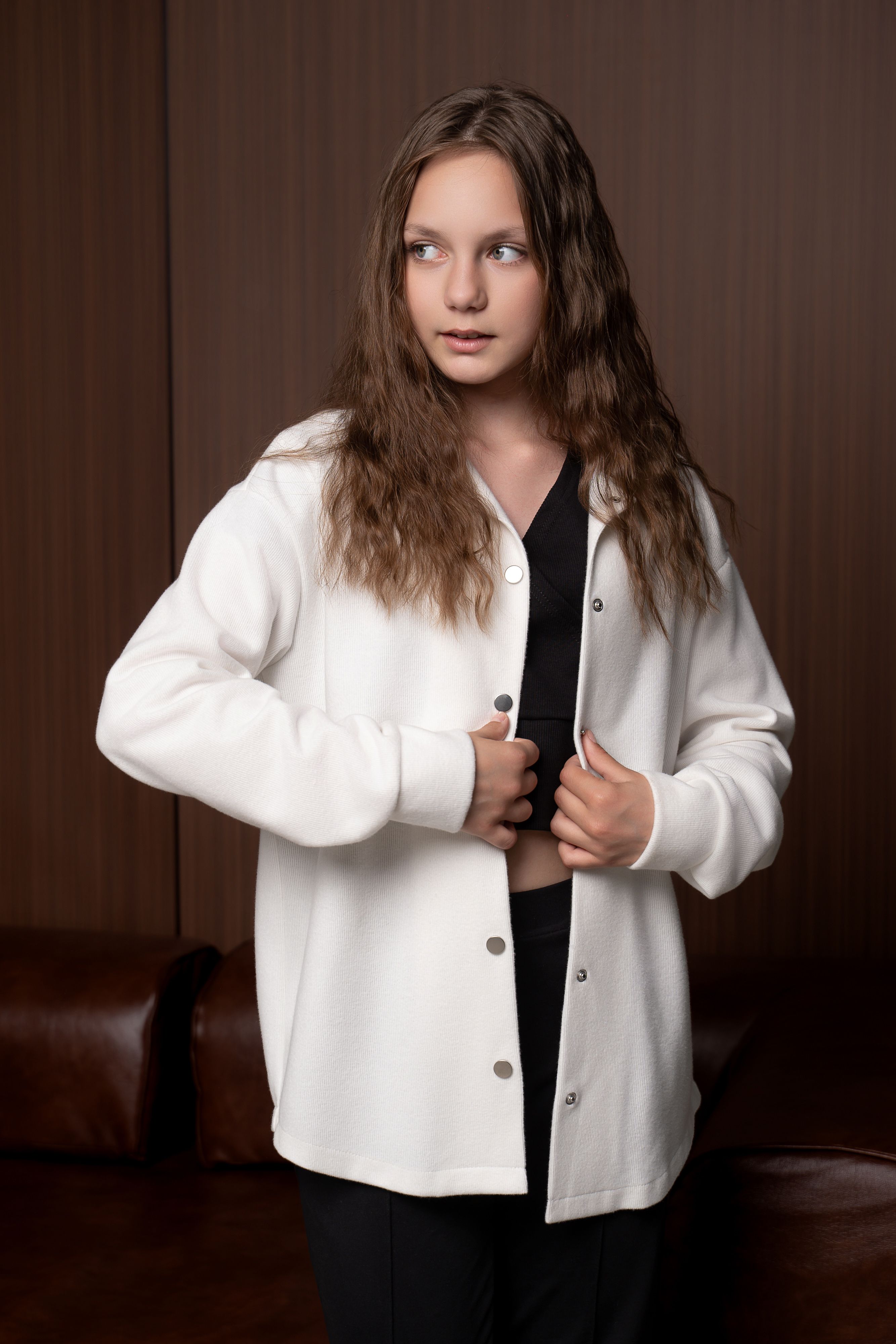 Тёплая длинная рубашка для девушек и девочек подростков — когда хочется стиль, уют и немного свободы в одном флаконе! Белая куртка на кнопках, с модным оверсайз-кроем и лёгкой приталенностью, чтобы подчеркнуть фигуру и не замёрзнуть. Хлопковый трикотаж — это комфорт, который вас согреет даже в самые переменчивые дни. Плюс дизайн, который говорит: «Я знаю, что такое мода!»
